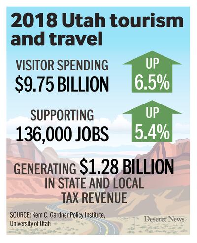 SALT LAKE CITY — Tourists dropped a record $9.75 billion into Utah’s economy last year, a 6.5% increase in spending over 2017, with national and state parks both reporting record visitation.