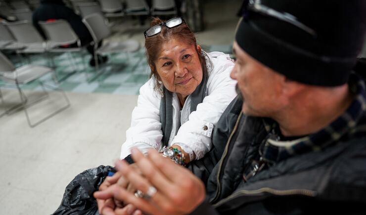 Daniel Gravley and his wife, Marilyn Peters, sat in the Weigand Center Tuesday evening, waiting for the daily shuttle to take them back to the mixed-gender Gail Miller Homeless Resource Center, where they both got beds to stay.