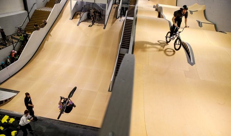 Take for instance the courtyards. At Woodward Park City, they are also terrain parks. Instead of adapting what they do to architecture that had some other use in mind, everything is tailored to the needs, imagination and development of action sport athletes of all genders, abilities and aspirations.