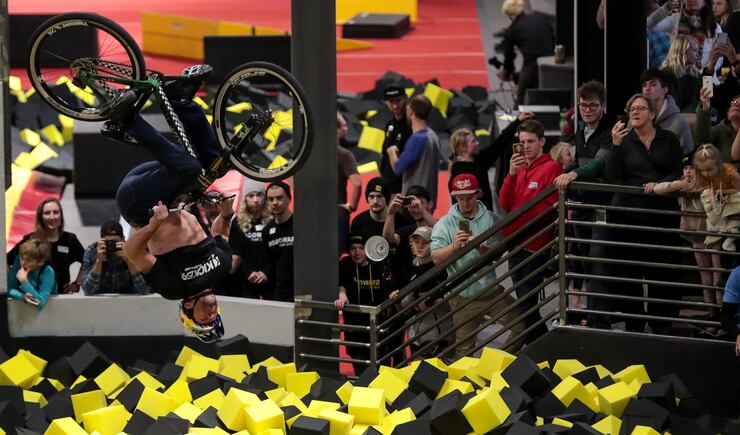 On Saturday, when hundreds of locals joined competitive athletes, including current and former Olympians, the energy was a mix of joy, wonder and adventure seeking. Parents joined their children hand-in-hand on trampolines that sent them flipping and flopping into foam pits.