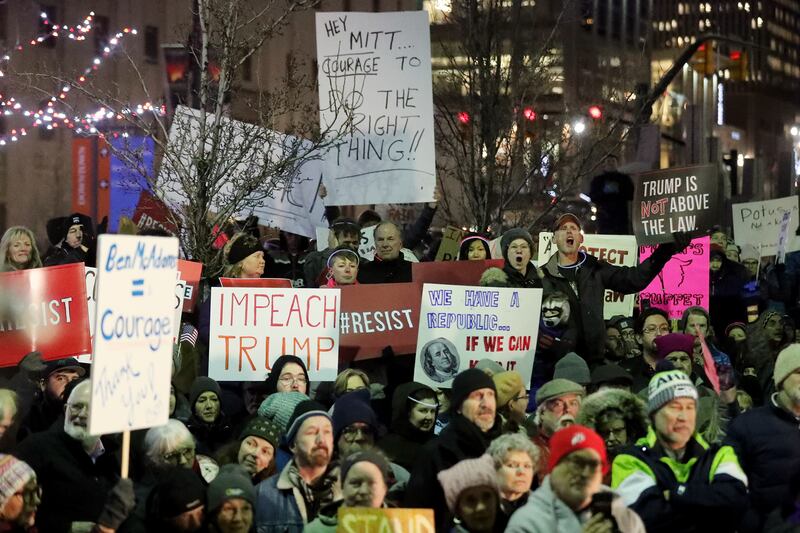 SALT LAKE CITY — Several hundred Utahns gathered downtown in the freezing cold Tuesday night to rally in favor of impeaching President Donald Trump.