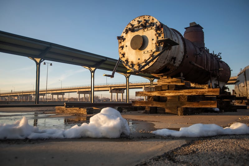 The components are sealed in the shop — except the rust-caked boiler, which is perched open to the elements on a platform nearby in the rear of the historic depot.
