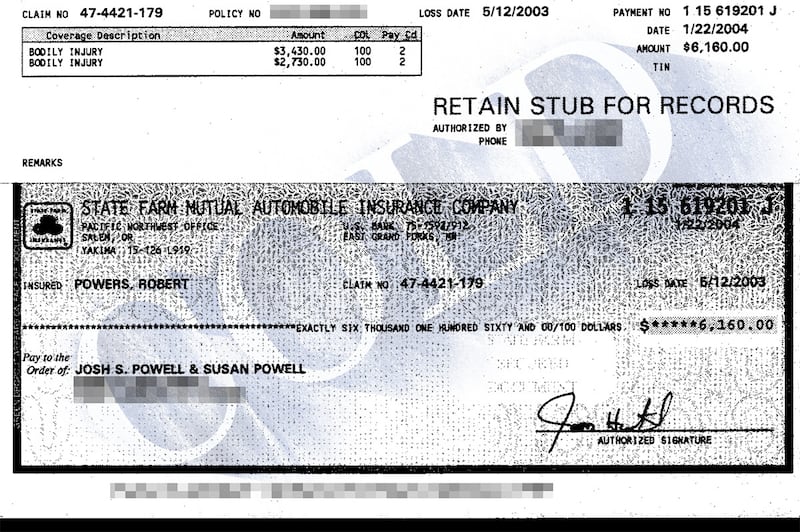Josh Powell, meanwhile, hounded Powers’ insurance company, State Farm, for money. State Farm eventually agreed to settle the claim for roughly $13,000, of which Powell pocketed more than $6,100.