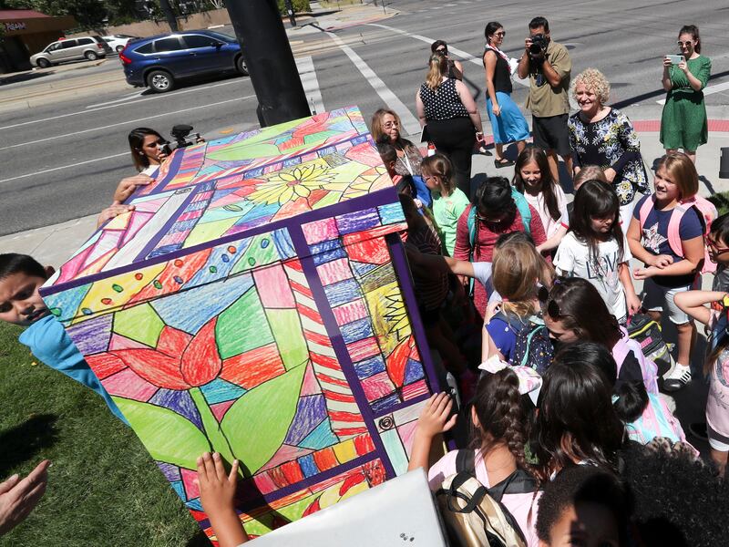 “Kids from every public elementary school in Salt Lake City participated in ColorSLC, turning bland, boring utility boxes into works of art like this,” said Salt Lake City Mayor Jackie Biskupski, indicating a decorated utility box across the street from Bennion Elementary School.