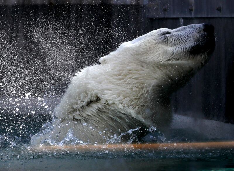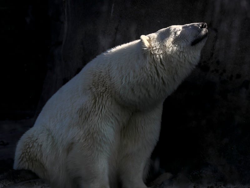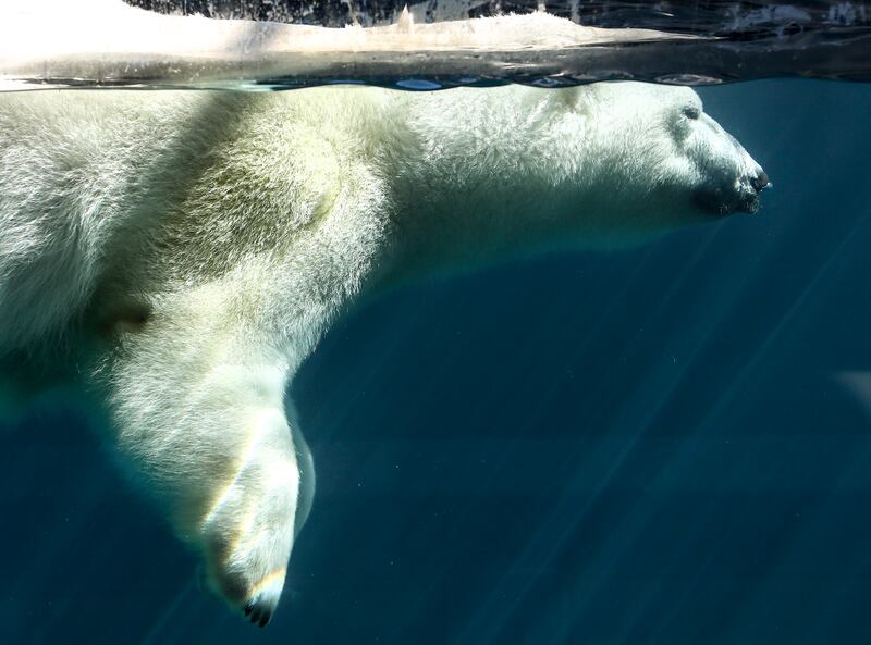 Nora the polar bear peaks into the sea lion enclosure as she swims in her pool at Utah’s Hogle Zoo in Salt Lake City on Wednesday. The 3-year-old polar bear broke her right front leg between her shoulder and elbow in January, presumably from her signature style of roughhouse play. According to the zoo, Nora was found in her exhibit on Jan. 23 unwilling to move. Keepers monitored her closely for a few days, but Nora didn’t budge. By Jan. 26, she made her way into the back holding area, allowing the zoo’s animal care team better access. An examination the next day confirmed the 500-pound bear, who had metabolic bone disease as a cub, broke her humerus, rendering her unable to walk. A large-animal orthopedic team from Texas A&M, a human orthopedic surgeon from University of Utah Hospital and a veterinary anesthesiologist from North Carolina State University performed surgery on Feb. 4. The procedure involved implanting heavy-duty orthopedic hardware such as screws and a special orthopedic pin. Nora arrived at the zoo in the fall of 2017 to be paired with then 2-year-old polar bear Hope. Born at the Columbus Zoo and Aquarium, the bear then spent a year at Oregon Zoo before moving to Salt Lake City.