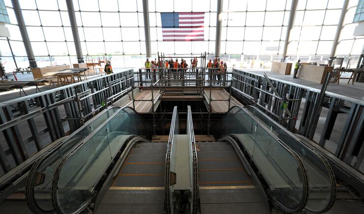 Monday, crews were hard at work in the terminal building and both concourses. In the south concourse, hammers and drills echoed as workers put finishing touches on windows and floors. In the north concourse, sparks flew as welders worked from the ceilings and heavy machinery beeped as they moved materials.
