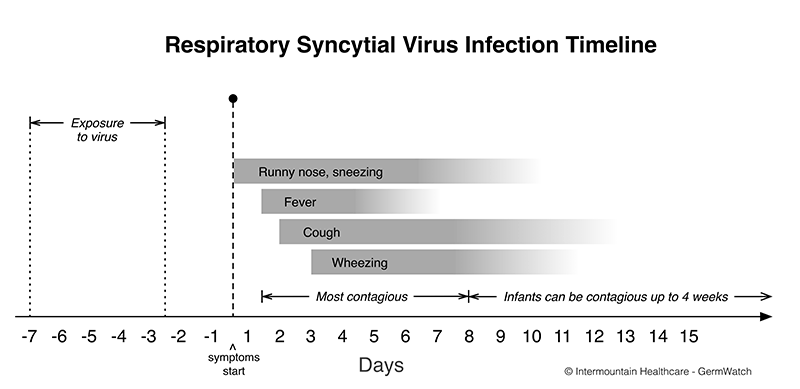 Symptoms of RSV typically develop within a week of being exposed to the virus, which is most commonly transferred by coughs and sneezes and can live up to six hours on surfaces. People infected with RSV are usually contagious for three to eight days, but young infants and people with compromised immune systems can be contagious for up to four weeks.
