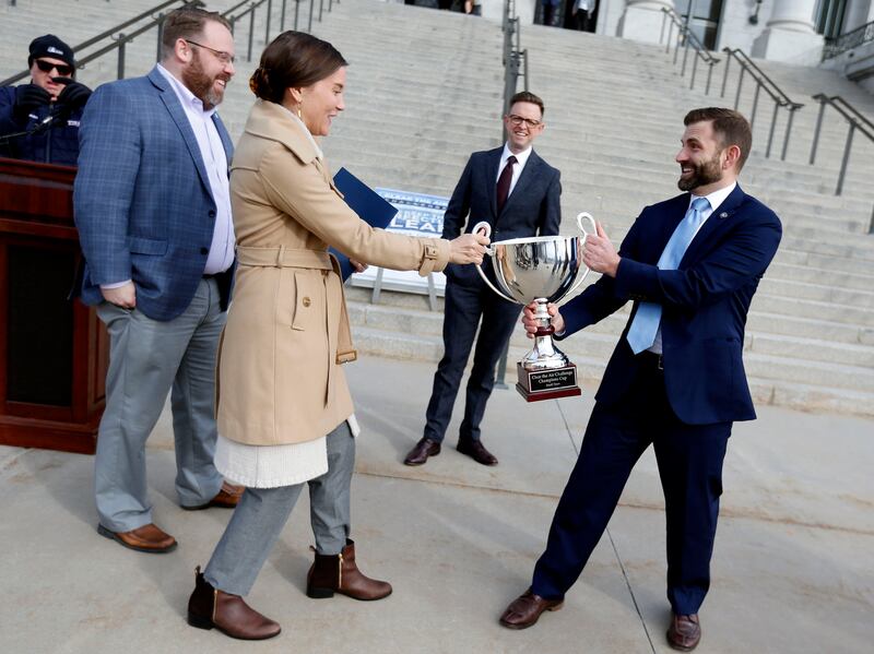 Salt Lake City Mayor Erin Mendenhall and Scott Baird, executive director of the Utah Department of Environmental Quality, jokingly fight over a trophy before the kickoff of the 11th annual Clear the Air Challenge at the Capitol in Salt Lake City on Friday. The Clear the Air Challenge, issued by business, government and community leaders, is a monthlong competition starting Saturday that gives Utahns the chance to reduce their vehicle emissions by choosing alternatives to driving alone. The Utah Department of Environmental Quality won the challenge in 2019. According to Baird, DEQ employees won by increasing their use of public transportation and inviting food trucks to their office location so that employees did not have to go out for lunch. The Clear the Air Challenge is a partnership between the Salt Lake Chamber, TravelWise and UCAIR. To learn more about the challenge, log on to cleartheairchallenge.org.