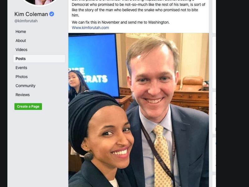 SALT LAKE CITY — Republican congressional candidate Kim Coleman deleted what some saw as a bigoted Facebook post Tuesday about a photo of Democratic Rep. Ben McAdams and Rep. Ilhan Omar, D-Minn.