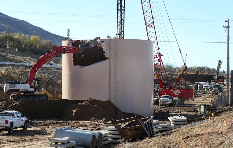 Crews from the Utah Department of Transportation Monday began dismantling the old Layton water tank near the intersection of Oak Hills Drive and U.S. 89 as part of the highway’s reconstruction project.