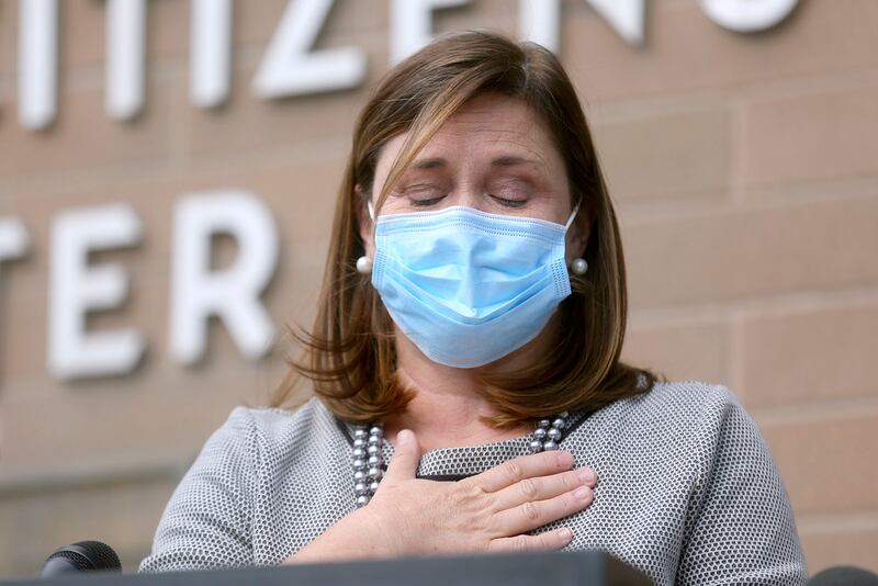 “I continue to be dumbfounded by messaging from our president, and others who believe him, that this is not a community crisis,” she said, choking back emotion that overcame her as she talked about losing her mother-in-law recently, and how coronavirus restrictions meant her children could not see their grandmother before she died. “It’s false, it’s dangerous and it’s misguided for the president to continue those conversations.”