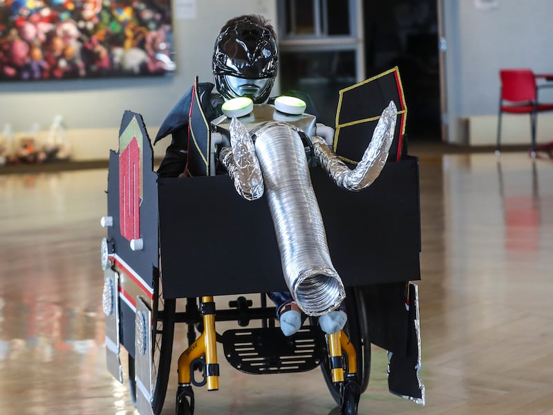 “They’re all fun, and they’re all challenging,” Lowell said of the wheelchair costumes. “You can see, like, we’re making a robotic mastodon today. I mean, that wasn’t what I thought when I woke up this morning.”