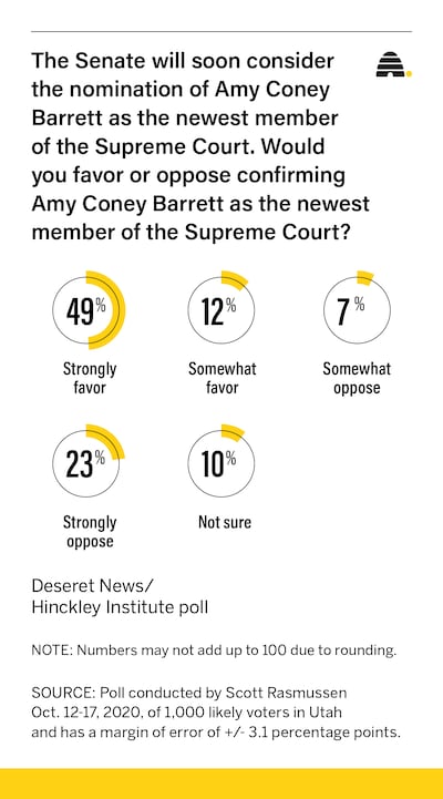 A new Deseret News/Hinckley Institute of Politics poll found 61% of voters in the state want to see Barrett become the newest member of the high court. The survey shows 30% oppose her confirmation, while 10% aren’t sure.