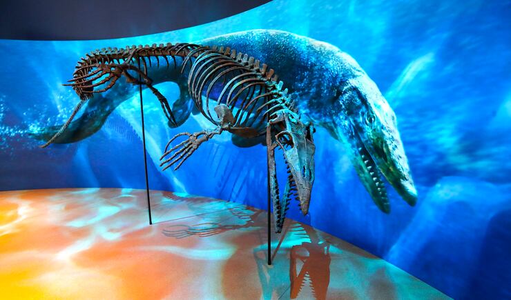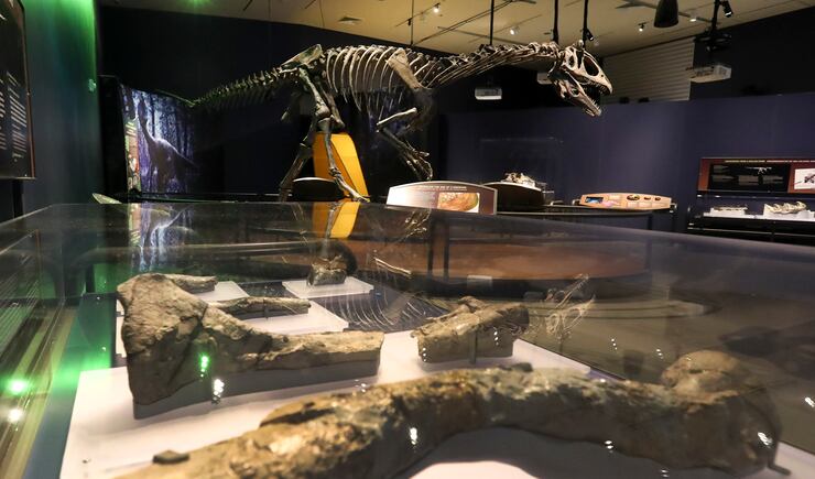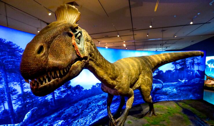 The exhibit, beyond its more than 100 fossils on display and life-size dinosaur skeletons, features immersive dioramas that transport the visitor back in time. The fossils come from four Antarctic dinosaur species, including the 25-foot Cryolophosaurus,