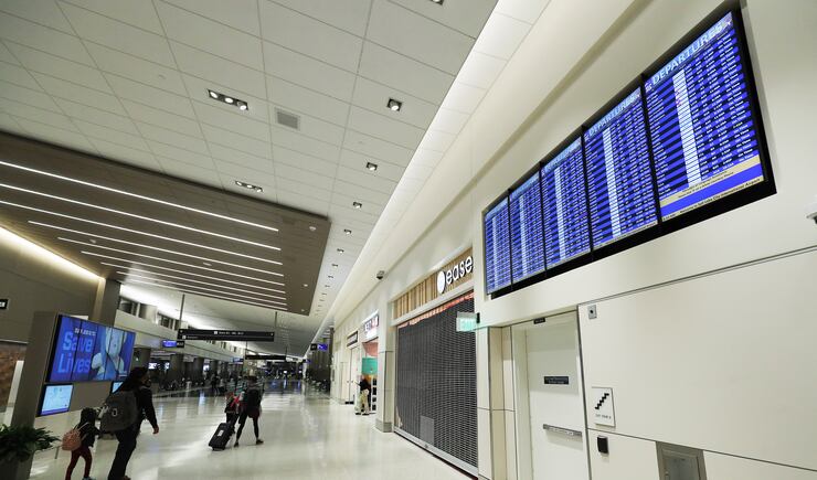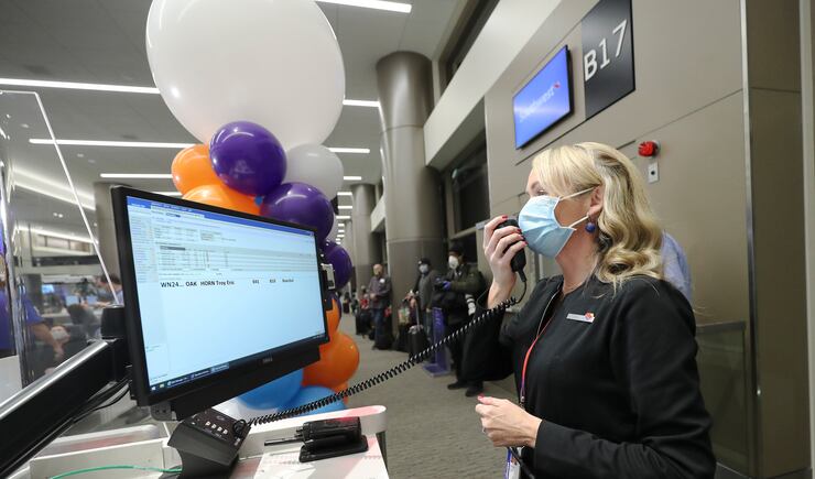 “We have terminated use of the old airport, which will soon be demolished in anticipation of the next phase of this airport,” he said. “So very exciting. It’s great to see real people here, masked up, social distancing, about to get on an airplane for the first time in this concourse.”