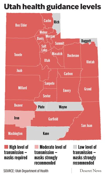 Two more counties — Uintah and Duchesne — have moved from moderate transmission status to high levels of transmission. Masks are required throughout the majority of the state, in 23 of 29 counties, according to the Utah COVID-19 Transmission Index, which was updated on Thursday.