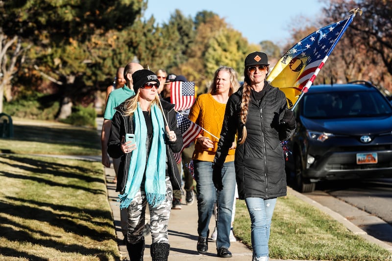 When another group gathered in the same church parking lot Thursday evening, they were met by Salt Lake police officers who explained that any signs or banners violated a city ordinance and warned that they couldn’t chant or yell at specific people or houses. Some of the protesters left after that conversation, but about a dozen men, women and children decided to carry several types of flags and stand on the sidewalk across the street from Dunn’s residence.