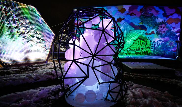 There are over a dozen pieces of art on display in Lumen Land, including one — a giant, light-up disco ball — that stands three stories high.