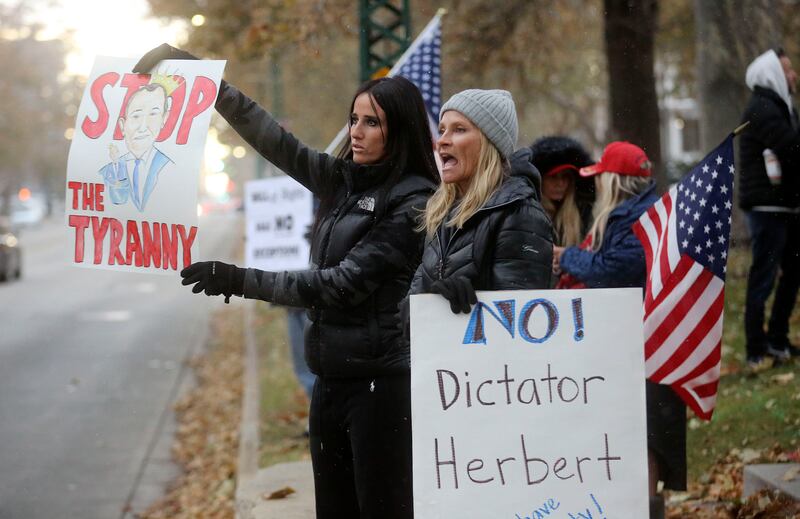 Carrying signs that read “Tyranny spreads COVID-19,” “No dictator Herbert” and “Our immune system is our God given PPE,” the crowd started small Monday afternoon, growing to about 50 people by 5 p.m.