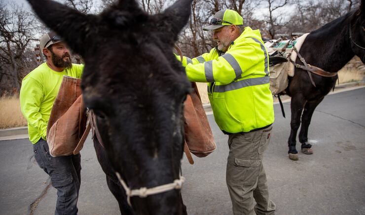 In this instance, mules were the preferred option given the weight of the closure equipment and the steep hillside. The animals easily navigated the hike, where the work could begin.