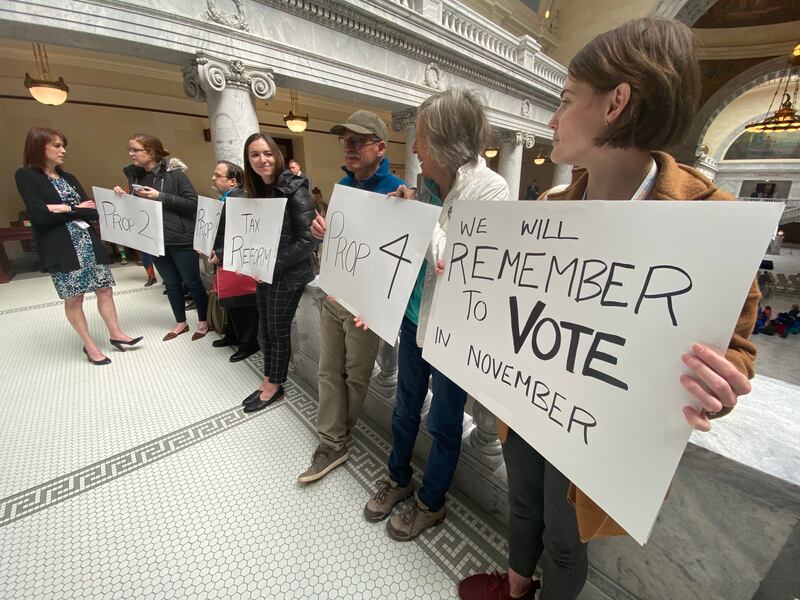 As news spread of the possible repeal of Prop. 4 throughout Utah’s Capitol Hill, protesters stood outside the House chamber holding signs paying homage to past propositions voters approved but lawmakers later altered, along with a sign that read, “We will remember to vote in November.”