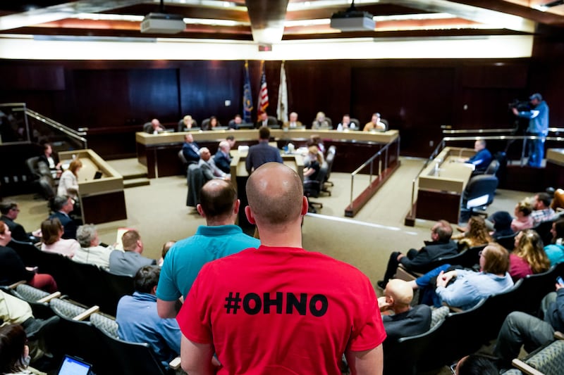 Wearing red shirts with “NO” printed in bold lettering, dozens of people showed up to Tuesday’s meeting to oppose the development, a number of whom voiced their concerns during the public comment period.