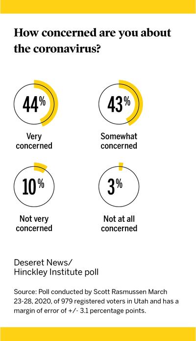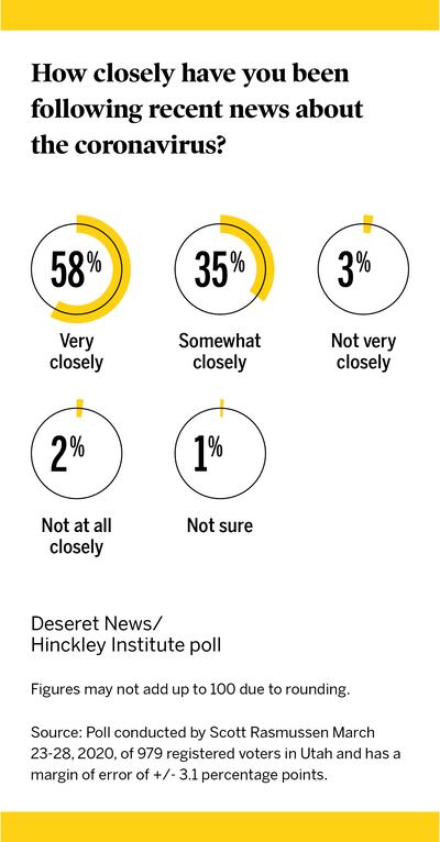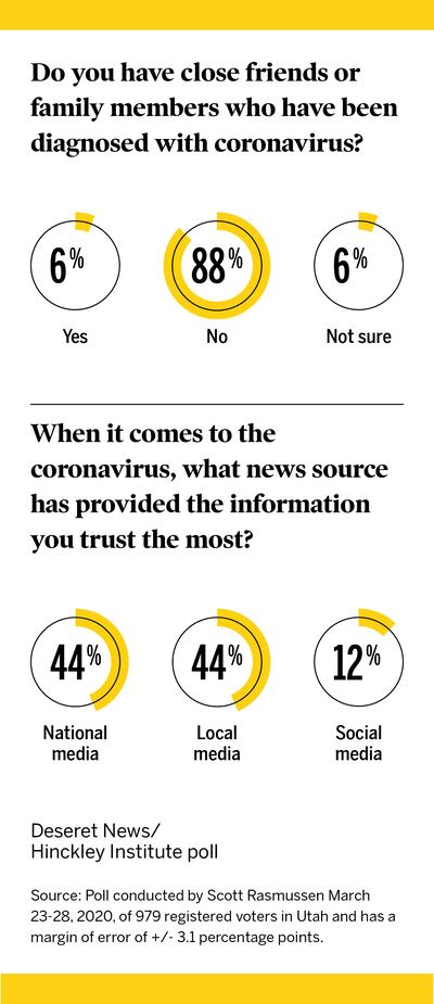 The poll shows 93% of Utahns are very or somewhat closely following news about the coronavirus. And when it comes to the virus, 44% say national media and 44% say local media provided them with the information they trust the most, while 12% say social media.