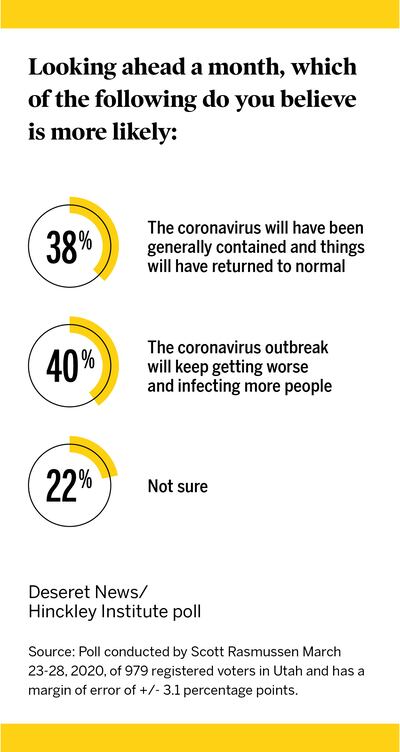 Vega is among 40% of Utahns who believe the virus will get worse and infect more people in the next month. Another 38% believe the virus will have been generally contained and things will have returned back to normal, while 22% aren’t sure.