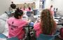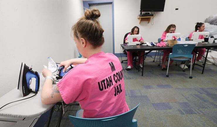 They’re assembling reusable masks in vibrant hues, like a pink that matches their Utah County Jail uniforms.