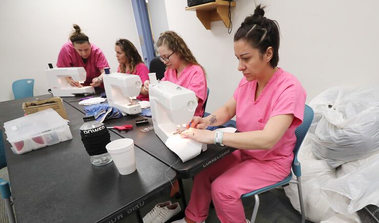 The protective wear is not just for use in the prison. It’s also going to hospitals and state agencies, said Jesse Gettler, the corrections production manager overseeing the effort. The inmates — each equipped with their own two masks — are at work stitching from 6 a.m. to 8 p.m. on weekdays and until 4 p.m. on weekends. Hourly pay remains at about $1.30.