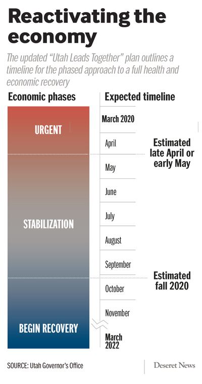 Herbert touted an updated “Utah Leads Together” plan for a health and economic recovery from the deadly virus, which now promises an end to the urgency in dealing with COVID-19 by late April or early May, shifting to a stabilization phase expected to last until fall before Utah moves into a recovery phase.