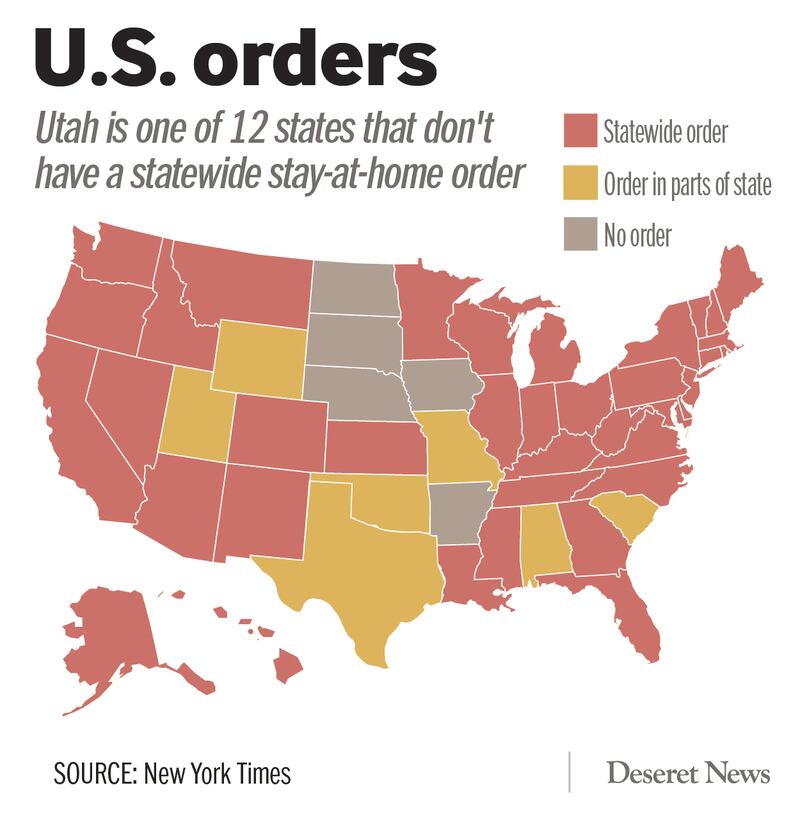 Gov. Gary Herbert last week directed Utahns to “stay safe, stay home,” but did not issue a statewide stay-at-home order like those set by at least 38 other states as of Thursday, according to the New York Times. Utah is among 12 states that have either no statewide orders or patchwork directives from counties that have issued their own unique orders.