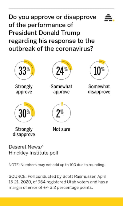 Independent pollster Scott Rasmussen surveyed 964 registered Utah voters April 15-21. The poll has a margin of error of plus or minus 3.2 percentage points.
