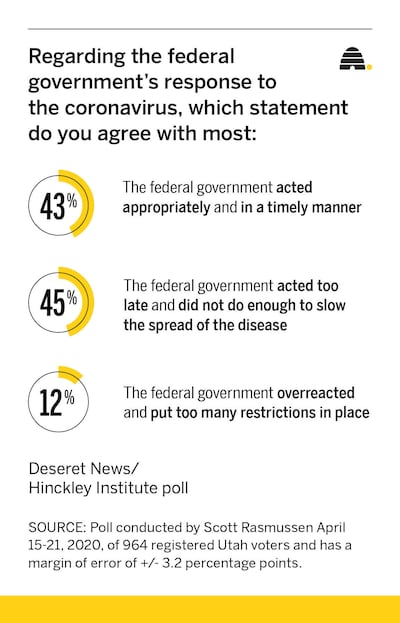 Those numbers show a slight shift but are similar to the results of a Deseret News/Hinckley Institute poll in March, with one exception. Utahns who say the government overreacted and put too many restrictions in place doubled from 6% to 12% over the past month.