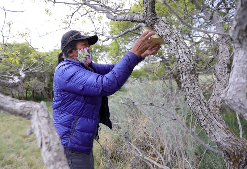 Insect trapper Sharon Gilbert set out traps Thursday on property in Rose Canyon in Salt Lake County owned by Kathy Fuller and her husband, Gary.