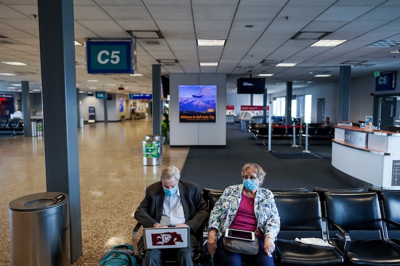 SALT LAKE CITY — Sharon and Norm Scott wore surgical masks and gloves as they sat next to each other in a near-empty terminal at Salt Lake City International Airport on Thursday.