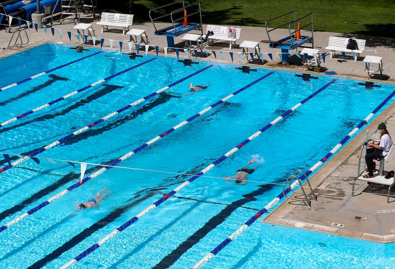 Under the state’s orange or moderate risk guidelines, only single-swimmer lap swimming is allowed with no “congregating” on pool decks. Under “yellow” or low-risk rules, “open plunge” swimming is allowed at a reduced capacity that “enables appropriate social distancing to be maintained between household groups on pool decks.”