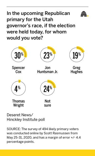SALT LAKE CITY — Lt. Gov. Spencer Cox has pulled ahead of former Gov. Jon Huntsman Jr. in the latest Deseret News/Hinckley Institute of Politics poll as Republican voters will cast ballots this month in the race for Utah governor.