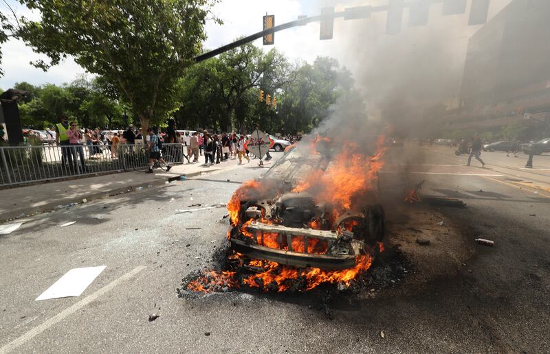 The patrol car was at 400 South near 200 East when protesters flipped it onto its hood and eventually set it ablaze. The burning police car was one of the most visible moments of the protest.