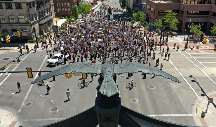 The procession halted several times throughout the march, once to invite all of the Black demonstrators and other people of color who’ve been profiled by the police up to the front of the crowd, and again outside of the Salt Lake City Public Safety Building to remember Black Americans killed as a result of racism.