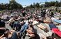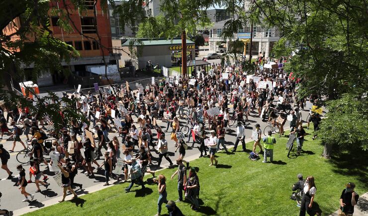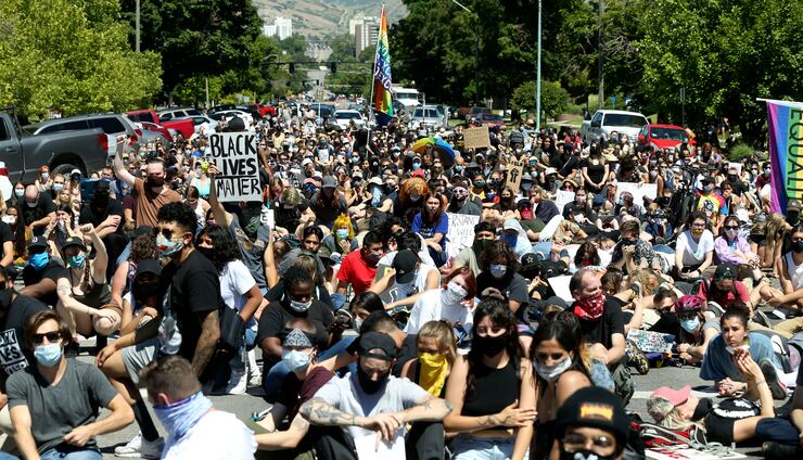 While gathering to begin the march, the crowd spread out across the grass at the foot of the Salt Lake City-County Building, largely keeping a few feet of separation between one another. Event organizers told protesters to wear masks and socially distance where possible. Some demonstrators kneeled in the grass making signs as the group prepared to start its march toward the state Capitol.