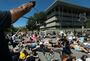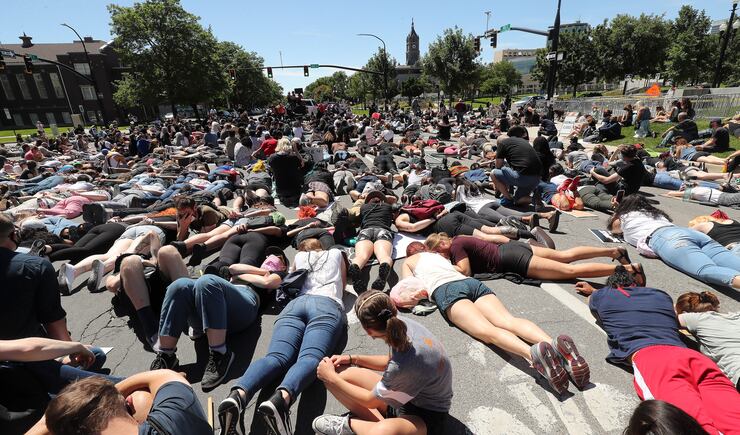 Protesters kneeled and laid down in the street without speaking as organizers read the names of those killed due to the actions of police officers and other acts of violence.