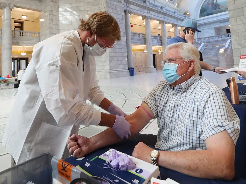 Since then, many lawmakers expressed interest in also receiving the antibody test, according to Senate chief of staff Mark Thomas. So state officials organized Friday’s group antibody test, fully covered by the state’s health insurance provider PEHP. Medical workers from University of Utah and Intermountain Healthcare drew vials of blood for the tests, and told lawmakers and staffers they would call them with their results in three to five days.