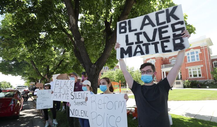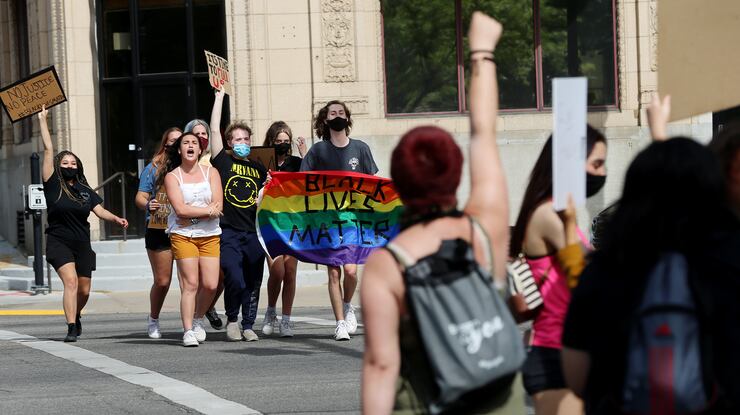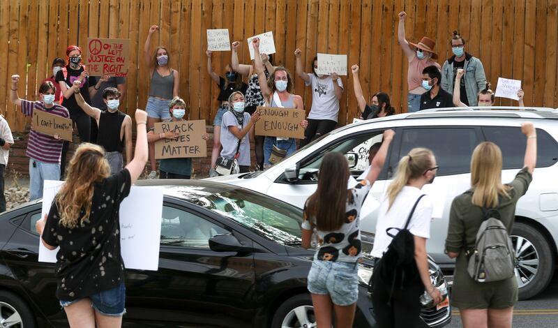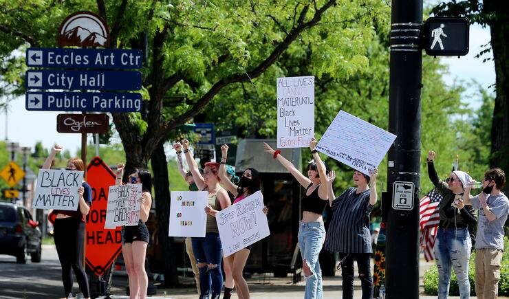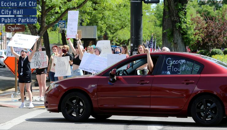 In Ogden, about 20 teens and young adults held signs near City Hall on the corner of 25th and Washington Boulevard Tuesday afternoon, chanting “Black Lives Matter” and “no justice, no peace.” Several drivers honked their horns and raised their fists in solidarity as they passed.
