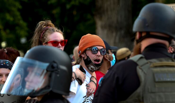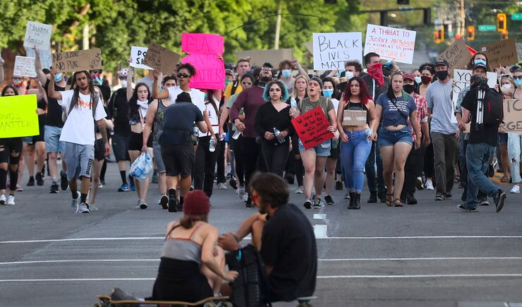 Police encouraged people to go home and leave the city streets at curfew, but they didn’t begin actively enforcing it until about 9 p.m. About 50 people continued protesting, walking partway to the Capitol before turning around and heading south on State Street. Police blocked off streets as they marched in north bound lanes and adjacent sidewalks.
