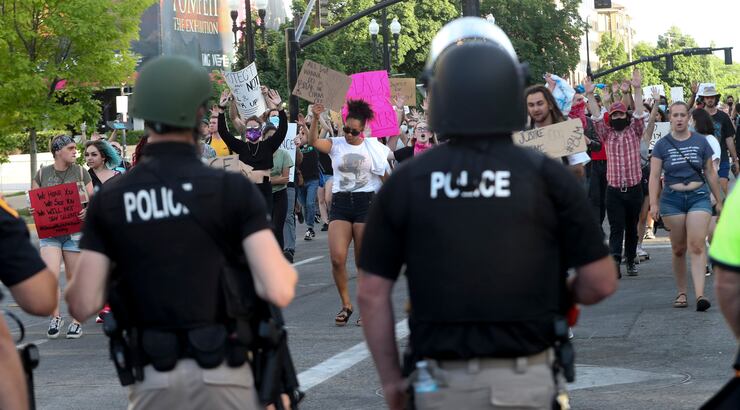 The crowd dispersed peacefully at about 8:10 p.m. when police crossed the street and told them they needed to leave for the night because of Salt Lake City’s curfew, put in place this week following destructive riots over the weekend. Before leaving, protesters called for the officers to take a knee with them, their cries intensifying as police crossed the street.