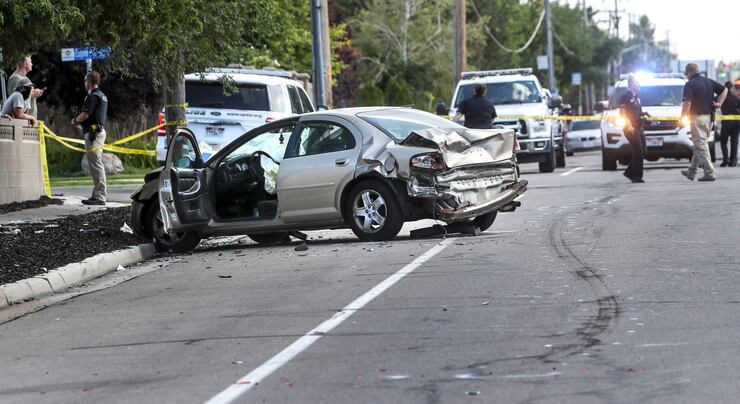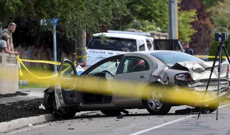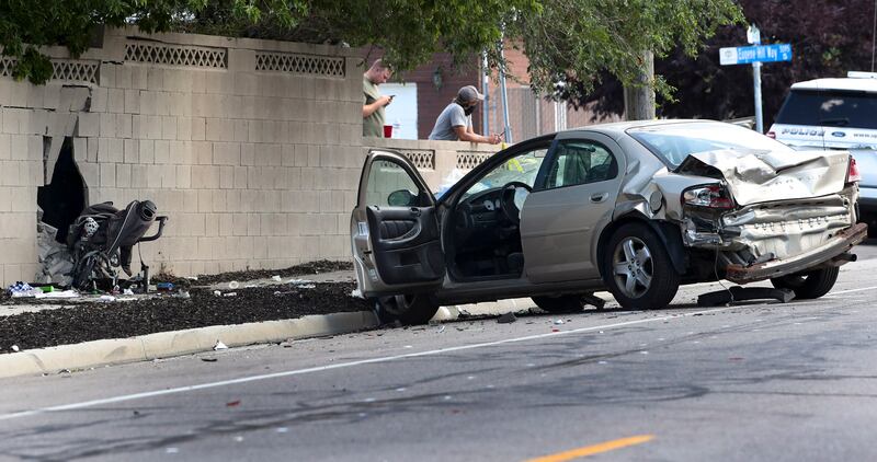 Shortly before 3 p.m, the driver of a gold sedan stopped abruptly at 5095 S. 3200 West after a dog ran into the road. Security footage shows the sedan braking and swerving slightly towards the sidewalk to avoid the dog, when it is rear-ended by a white pickup truck. The impact sends the sedan careening over the curb and onto the sidewalk where it momentarily pinned the mother and the stroller between the car and a large cinder block wall.