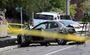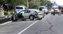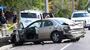 The sedan’s airbags were deployed during the impact, which left a large hole in the concrete wall and scattered debris across the sidewalk.