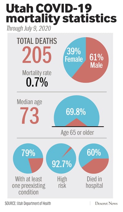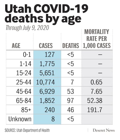 Nearly half of Utah’s deaths caused by the virus, 97 of them, have been among people between the ages of 65 and 84, with a quarter of the overall death toll — 46 — over age 85.