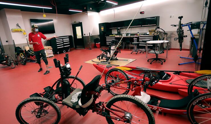 A garage filled with adaptive bikes and skis and kayaks gives patients an idea of what they’re capable of, said Keegan Buffington, mobility program coordinator.